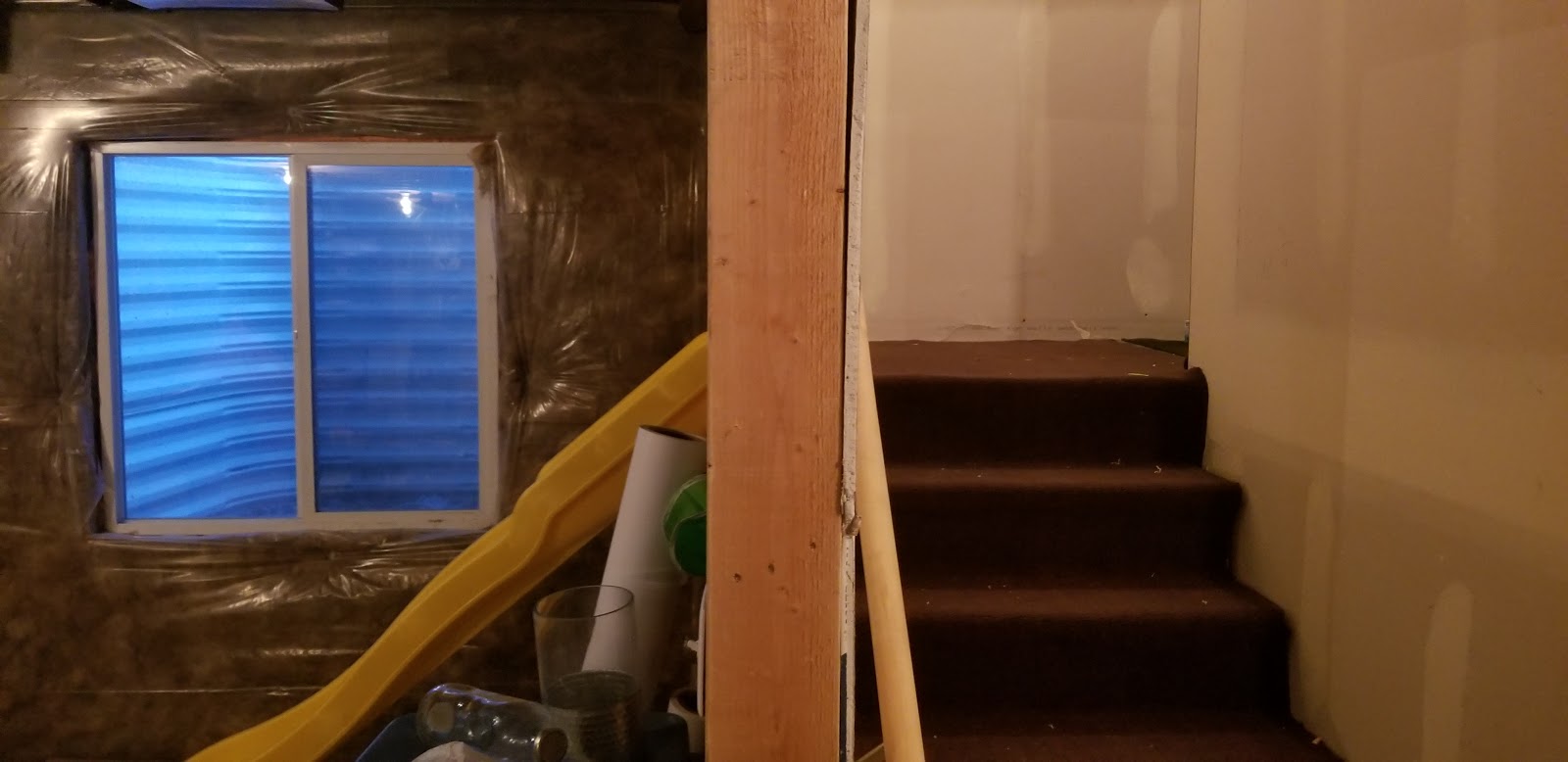I came home and cut a whole in the wall on the stairwell landing going down into the basement. Lucky Dragon kept asking me why "you just built this brand new how and now you are cutting holes in it?!" However, he was excited for the finishing touches. The slide goes down the landing into the basement where the trampoline is already located. Apparently, we want to have a full on active gym in our basement!