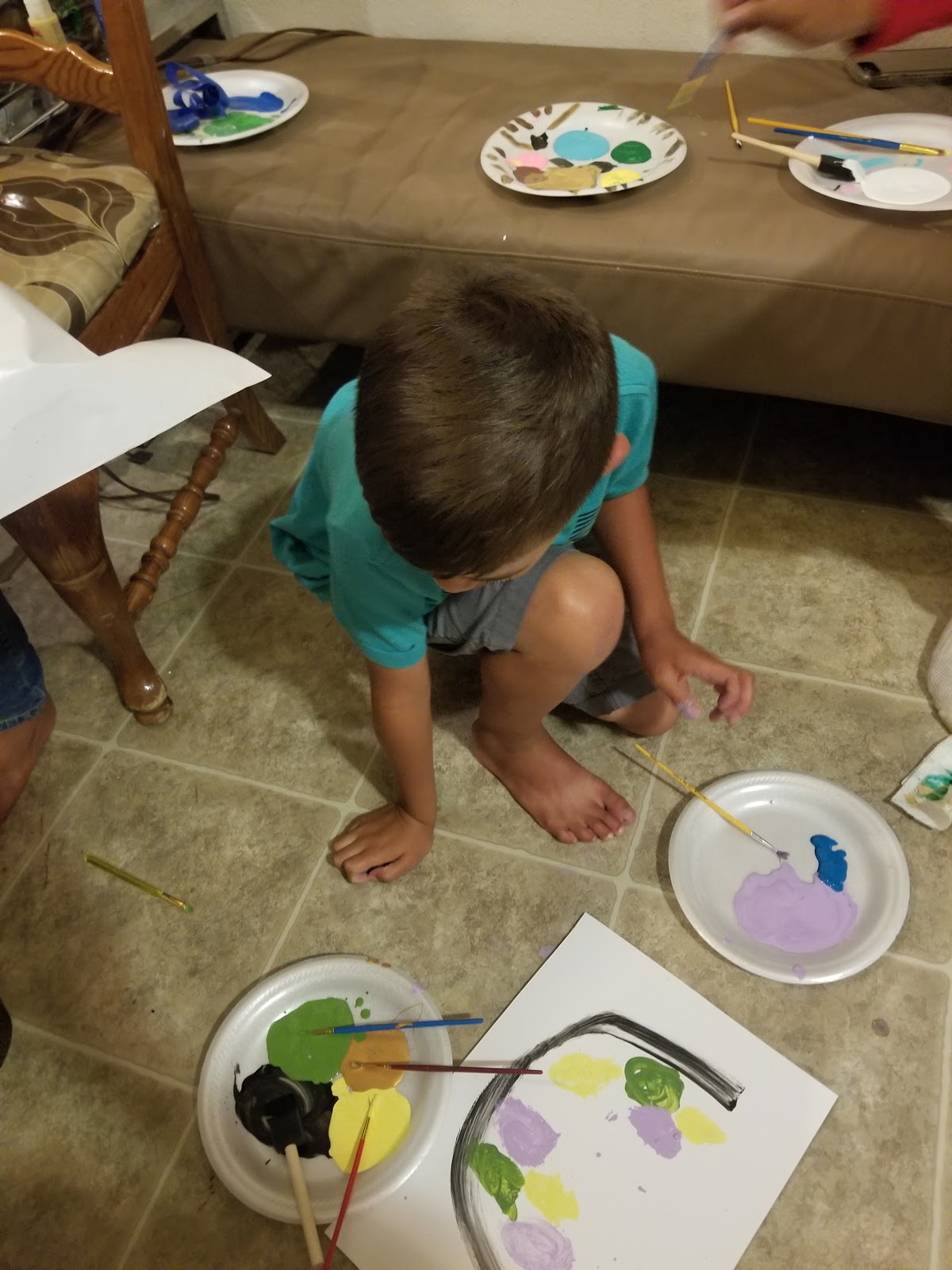 That night I had an idea to have a family paint night. We all got together and we painted. The rules were that we had to all incorporate three colors: blue, green and yellow. And the painting had to be something that reminded them of Hawaii. It was so much fun to see everyone paint. From the smallest little people, to the adults. We all came up with some great pieces.