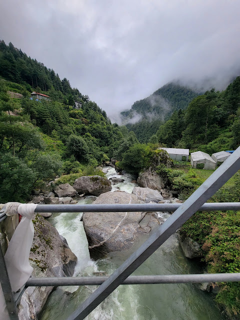 The airport in Lukla is at an elevation of 2800 meters in elevation. (just over 9000feet). The airport is built on the side of a cliff that drops the whole 9000 feet straight down. Because of the steep cliffs and dense valleys, radar and technical navigation do not work. Pilots rely on their sight to land. It is a short runway and they have to hit it at the exact angle and exact speed or disaster happens. Due to all of this, it is deemed the most dangerous airport in the world. So knowing all of this, what did we decide to do?! Let's go! The clouds were so thick that planes would not travel to Lukla. Luckily, there was a helicopter going up with supplies and coming down with some other trekkers. So we jumped in. Again, not a trip for the faint of heart. The high mountains and steep winds tossed the helicopter into lurches. Once we arrived at the top of the mountain I saw the pilot tense as we flew into the clouds and vision was handicapped. All I could think about was the chorus to the song by the Chain Smokers that goes, "If we go down, we go down together..." That became the unsolicited mantra in my head the rest of the week!