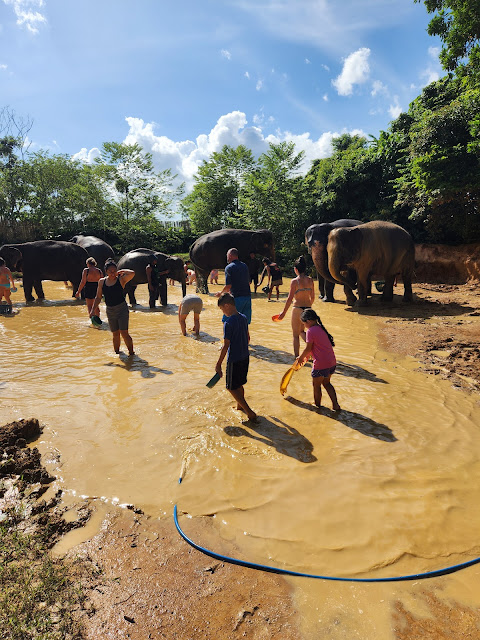We went to the Elephant Jungle Sanctuary in Phuket (they have other places throughout Thailand). They take rescue elephants and give them a safe place to live. We were able to learn about each of the elephants and their stories. One of them was from the circus and would sway. They told us the reason she sways is because she was always chained up and cannot move. They said that elephants are constantly moving to help digest all the food they eat and when chained up they cannot move far, so they sway. It was sad to watch her. They also showed us the pink pigmentation spots on their heads, trunks and ears are not natural and are scars from being beaten for forced labor. In that moment I was glad we chose a place that does not allow you to ride the elephants.
