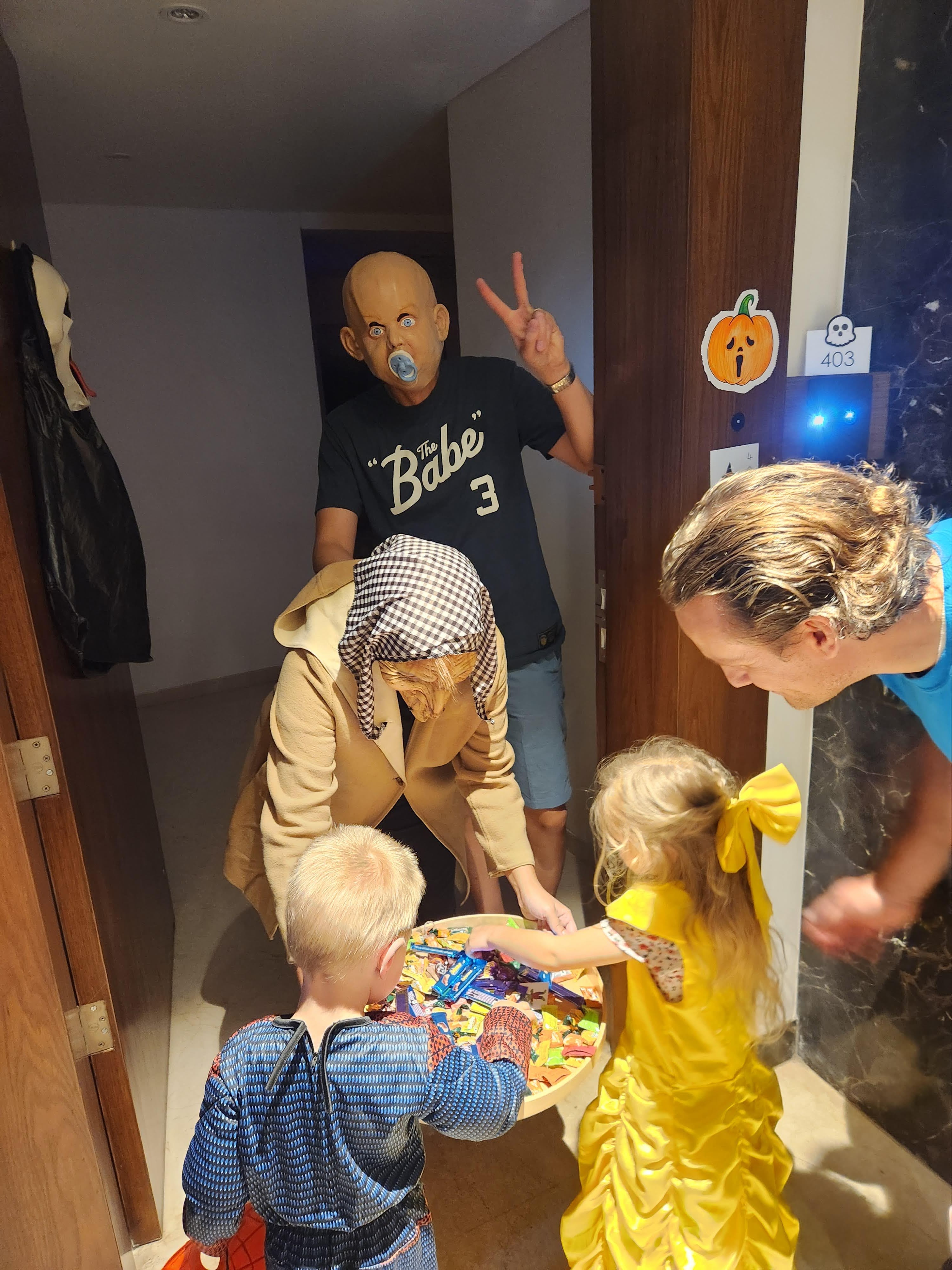 We went to every home available for trick-or-treating. We would start at the top of the building and make our way down floor by floor. We were all sweaty and hot by the end. But I guess the kids all had to work for that candy!